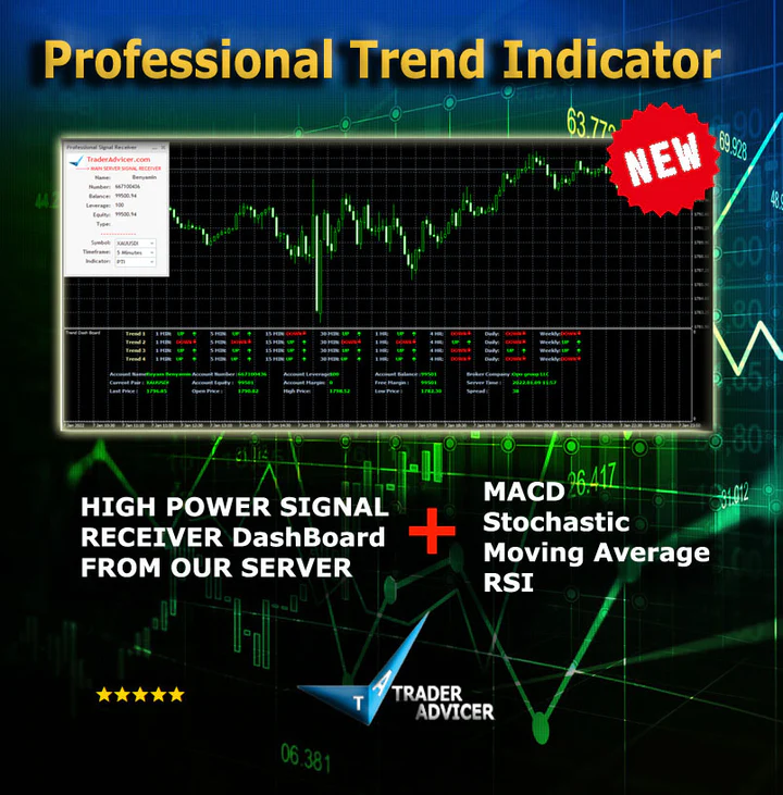 Professional Trend Indicator for MT4 provides BULLISH or BEARISH trend information and provides UP and DOWN arrow signals. The trend information is based on MACD, Stochastic, Moving Average, and RSI MetaTrader indicators. So, forex traders can use them in any technical trading strategy to BUY and SELL based on the arrow signals.